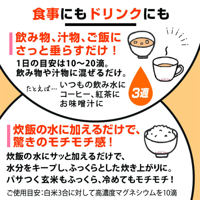 1日10滴を目安に、水や飲み物、汁物にさっと垂らすだけなので、いつでもマグネシウムが補給可能。
