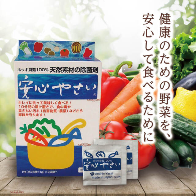 『安心やさい』はホッキの貝殻から生まれた野菜洗浄剤です。食材の表面に付着する有害物質や農薬、腐敗菌などの見えない汚れを除去し、さらに細菌の繁殖を防止します。