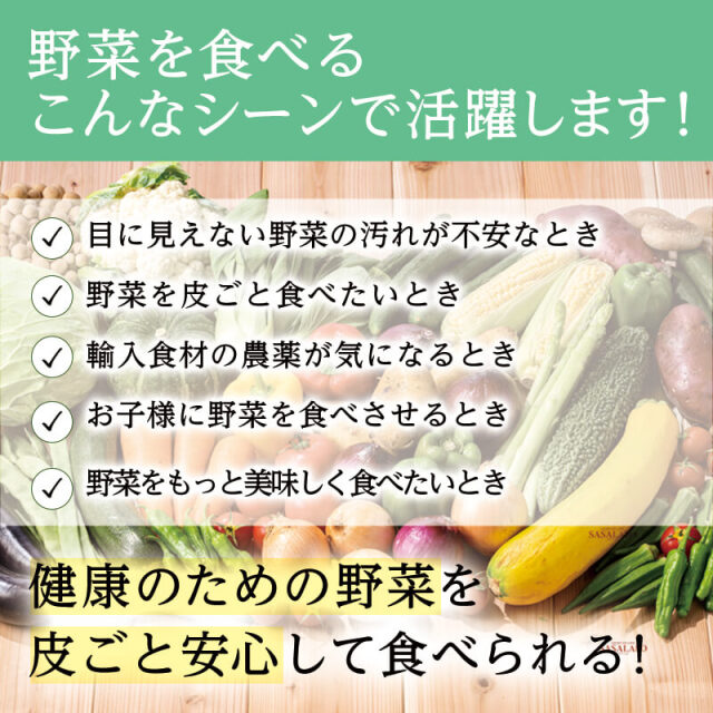 一方、野菜の有害物質を心配しながら食べるのは本末転倒です。天然素材の野菜洗浄剤なら安心して皮ごと野菜を食べられます。